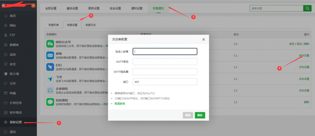 打开面板设置》》警告通知》》警告设置》》邮箱设置